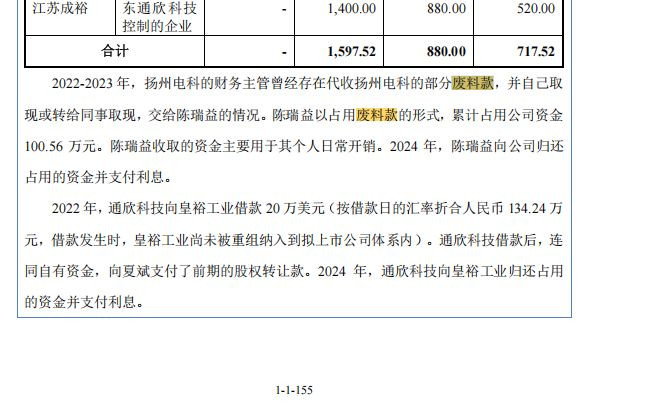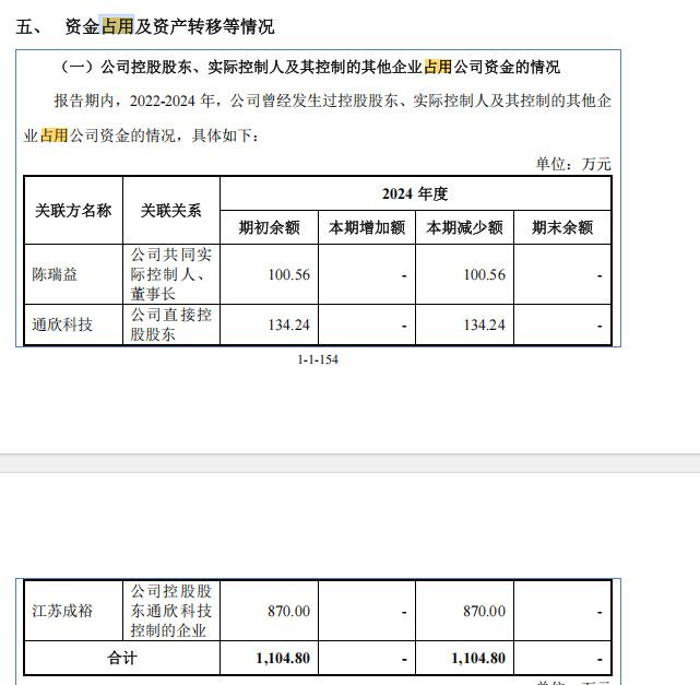 更令人关注的是资金占用问题。2022年至2023年,陈瑞益以占用废料款的形式,累计占用公司资金100.56万元。2024年,陈瑞益向公司归还占用的资金并支付利息。另外,实控人控制的江苏成裕也曾占用公司资金,而公司又同时向江苏成裕采购电镀加工服务,形成“资金占用+业务往来”的复杂关联关系。