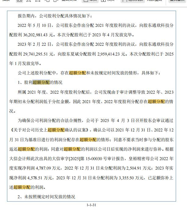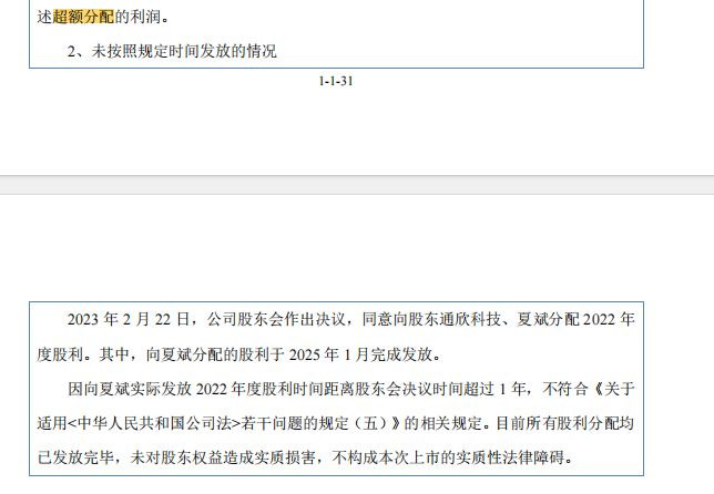 2022年5月和2023年2月,公司股东会分别决议分配2021年度和2022年度股利,合计向股东分红超过6800万元。然而,由于审计调整导致期初未分配利润低于分红金额,这两次分红实际上构成了超额分配。