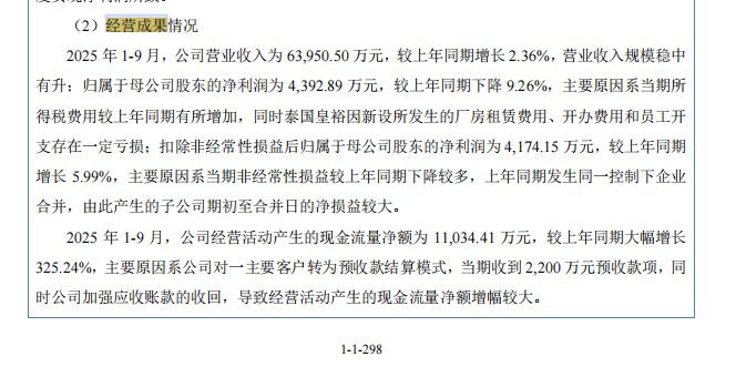 利润端表现更为疲软:2023年扣非净利润3600.27万元,同比下滑16.38%;2025年前三季度归母净利润4392.89万元,同比下降9.26%。公司解释称,净利润下滑主要系当期所得税费用增加,以及泰国皇裕新设产生的厂房租赁、开办费用等亏损所致。
