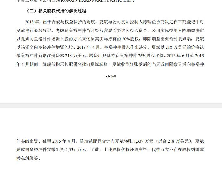 然而,由于当时相关法律规定中方股东不得为境内自然人,这26%股权由陈瑞益控制的皇裕工业代持。直至2013年,夏斌才显名还原其被代持的26%股份。