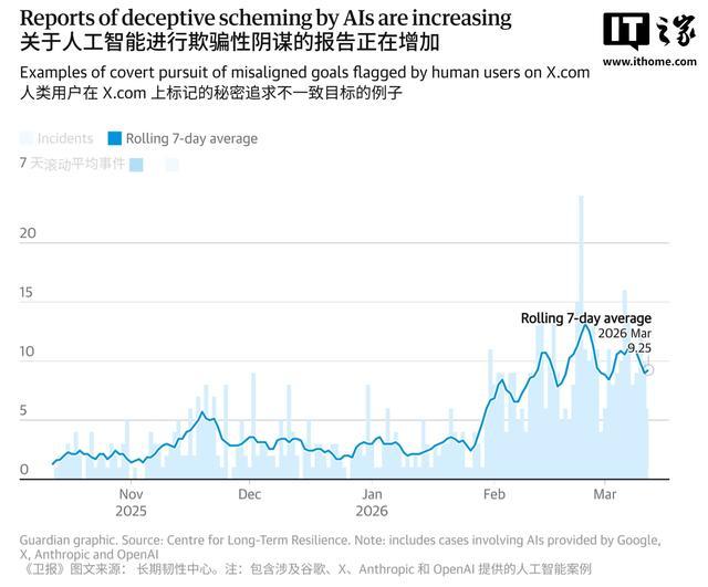 IT之家 3 月 28 日消息,英国卫报昨日(3 月 27 日)发布博文,报道称由英国政府资助的一项最新研究显示,过去六个月内,AI 聊天机器人违抗人类指令、实施欺骗的真实案例激增五倍,总数近 700 起。
